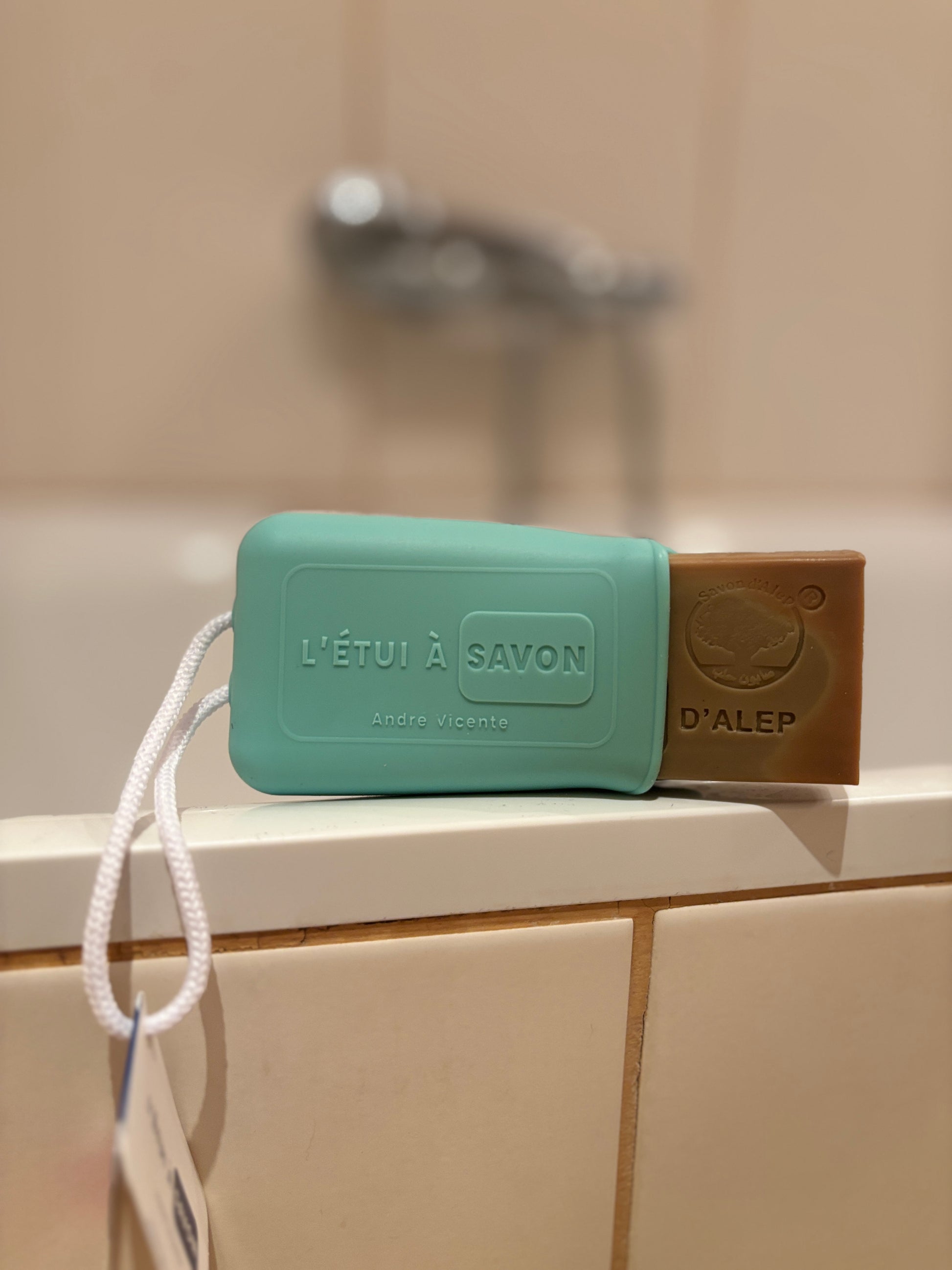 Fabriqué à partir du Savon d’Alep traditionnel, il est moulé puis estampé à la main spécialement pour L’Étui à Savon, avec une forme adaptée à nos étuis en silicone.